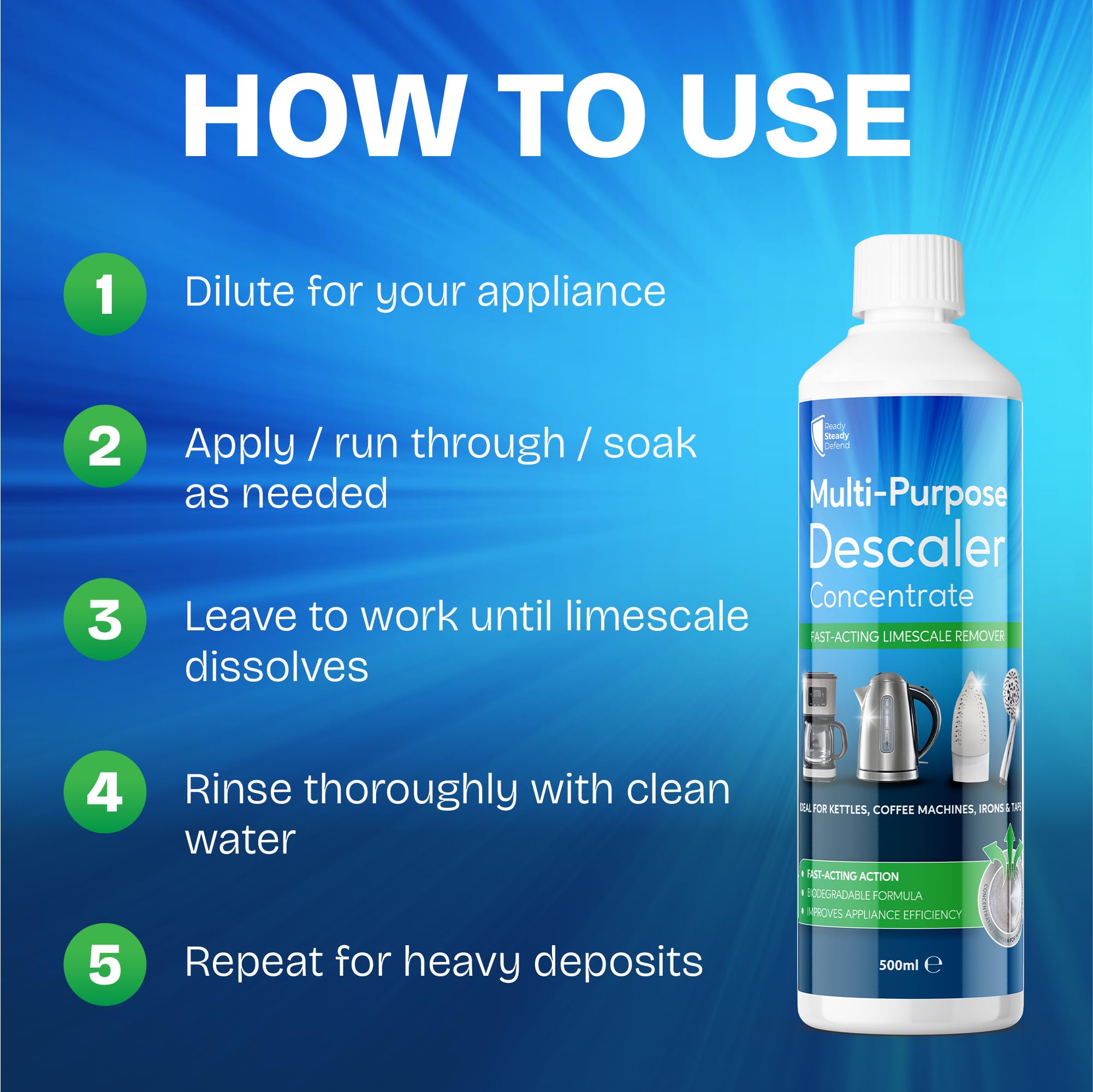 - FAST ACTING DESCALING POWER - Fast acting multi purpose descaler concentrate designed to quickly break down and dissolve stubborn limescale and mineral deposits caused by hard water, helping restore appliance performance while reducing scale build up on internal and external surfaces