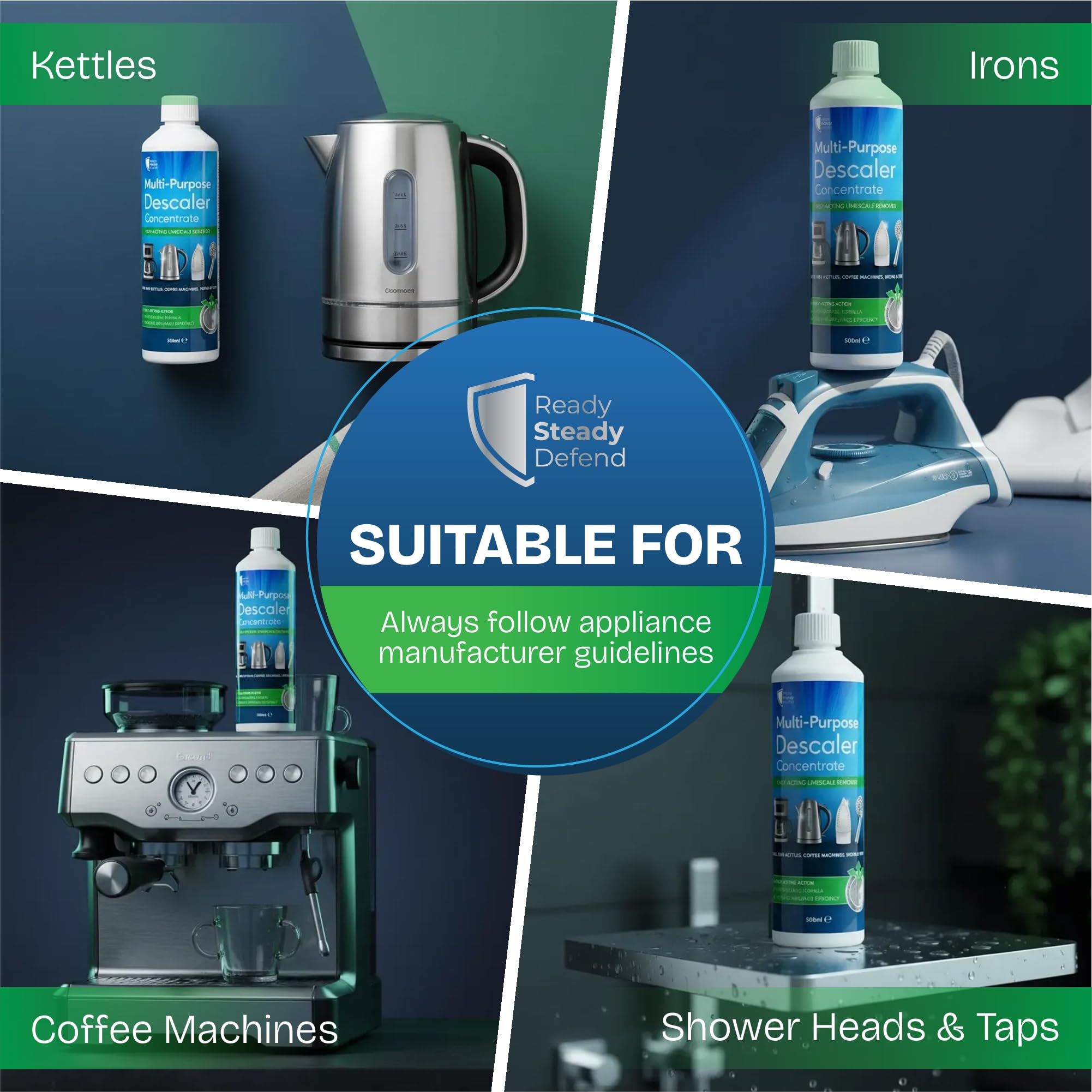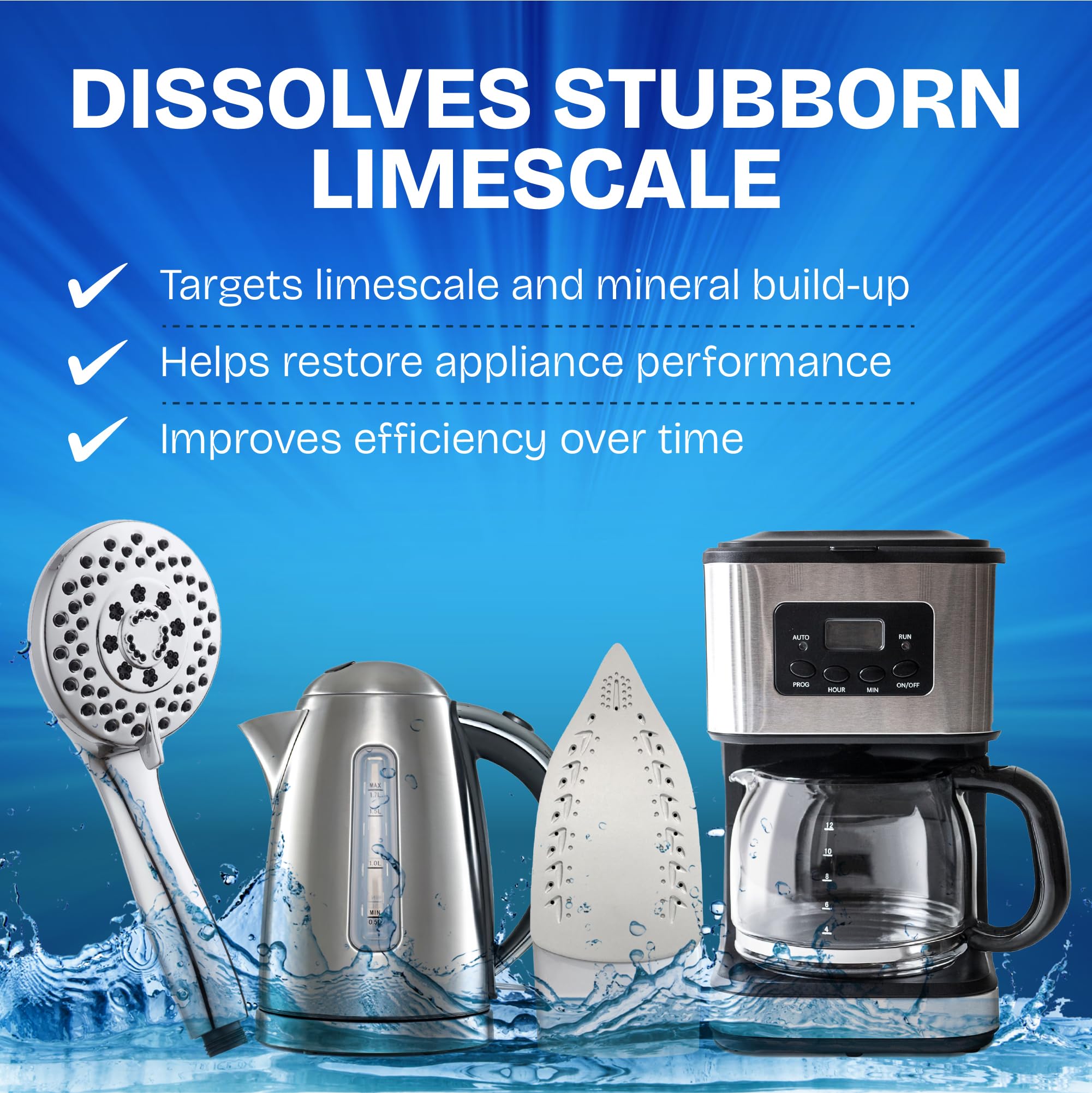 - SUITABLE FOR MULTIPLE APPLIANCES - Suitable for kettles, coffee machines, shower heads, taps and compatible irons, this versatile limescale remover works across household appliances and bathroom fittings, providing an effective solution for regular descaling and ongoing maintenance