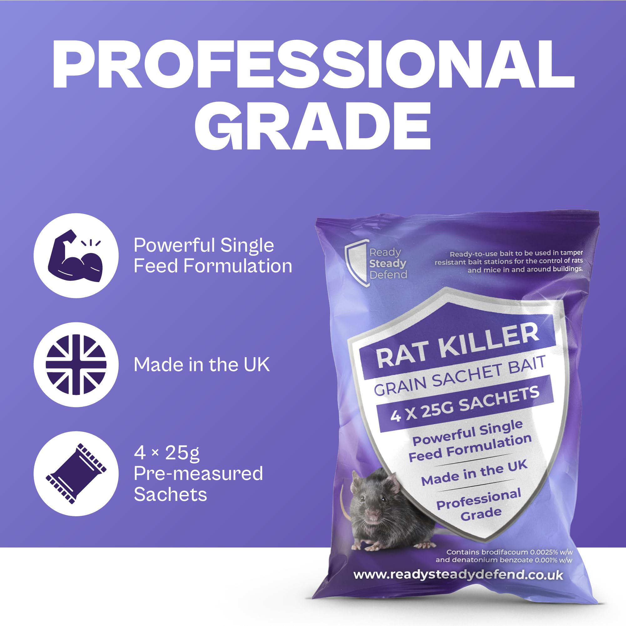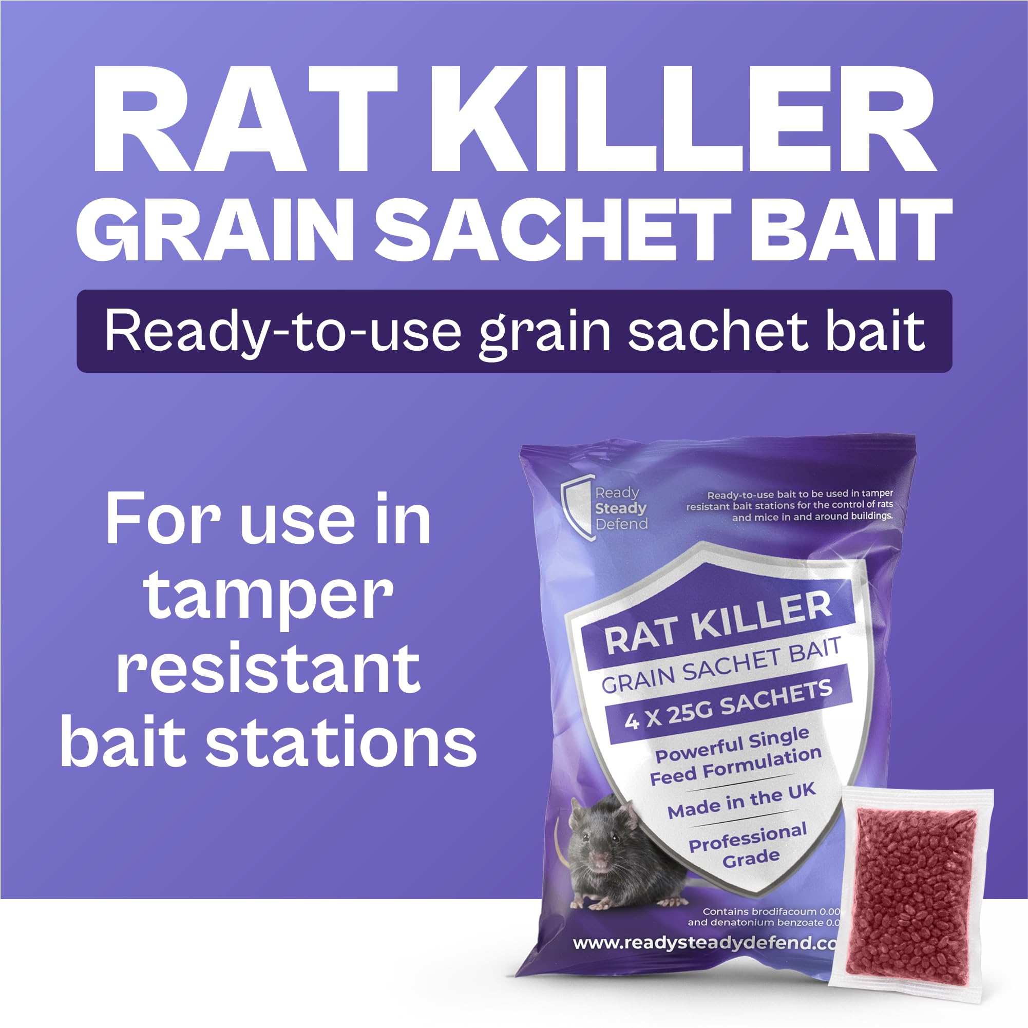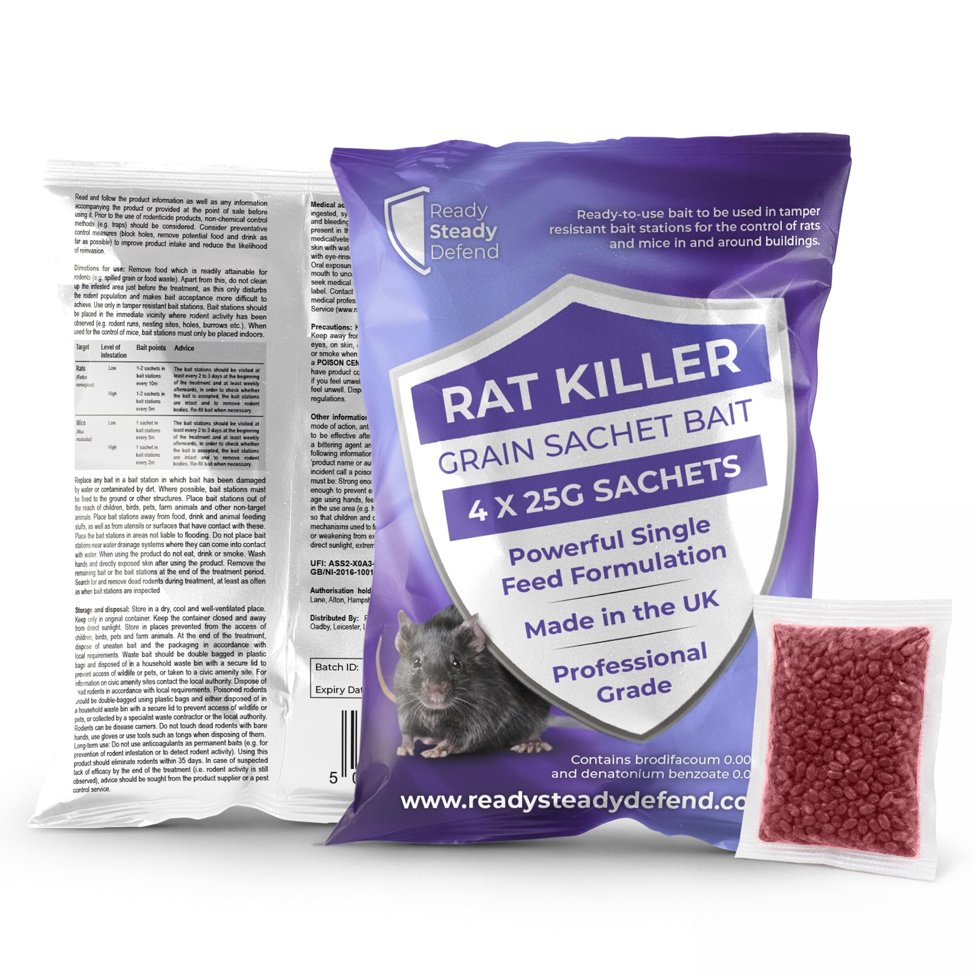 Details: Ready Steady Defend Rat Killer Grain Sachet Bait is a professional grade, ready-to-use rodenticide for controlling rats and mice in and around buildings. Pack contains 4 x 25g grain sachets with a powerful single feed formulation. Contains brodifacoum 0.0025% w/w and denatonium benzoate 0.001% w/w plus a bittering agent and dye. Before use, read all product information. Consider traps and prevention (block holes, reduce accessible food and drink). Remove readily available food, but do not disturb the infested area immediately before baiting. Use only in tamper resistant bait stations placed where activity is seen. For mice, bait stations must be placed indoors only. Fix stations where possible, keep them dry, and place out of reach of children, pets and other non-target animals. Keep stations away from food, drink and animal feed. Dose guide: Rats low 1–2 sachets every 10m, high 1–2 sachets every 5m. Mice low 1 sachet every 5m, high 1 sachet every 2m. Inspect stations every 2 to 3 days at the start and at least weekly afterwards. Refill when needed, replace bait damaged by water or dirt, and remove rodent bodies. Safety and storage: avoid contact with eyes and skin and do not breathe dust. Do not eat, drink or smoke when using, wash hands after. Store locked up in the original closed container, in a dry, cool, well-ventilated place away from direct sunlight. Medical advice: contains an anticoagulant. If swallowed, seek medical advice immediately and show the label. Symptoms may be delayed. Antidote is Vitamin K1 by medical/veterinary personnel only. In case of incident call UK 111. Disposal: remove remaining bait and stations at the end of treatment, search for dead rodents, and dispose of bait, packaging and rodents to local requirements (double-bagged, secure-lid bin or civic amenity site). Hazardous to wildlife. Do not use anticoagulants as permanent baits. UFI: ASS2-X0A3-700K-WWC8. Authorisation GB/NI-2016-1001-0005. Delayed action, can take 4–10 days max.