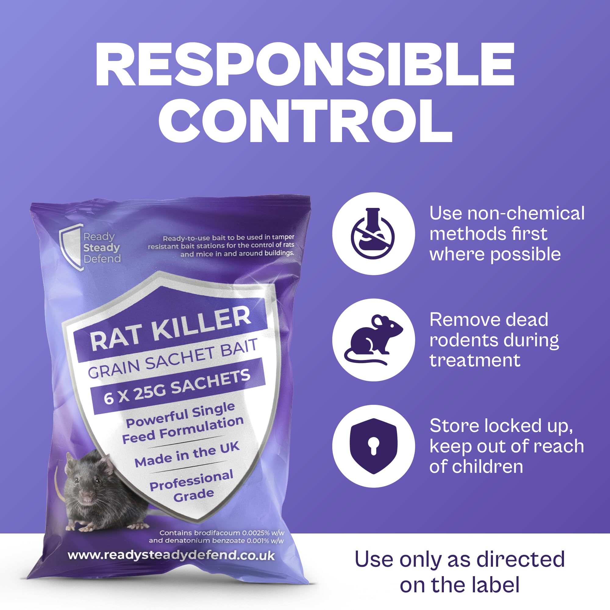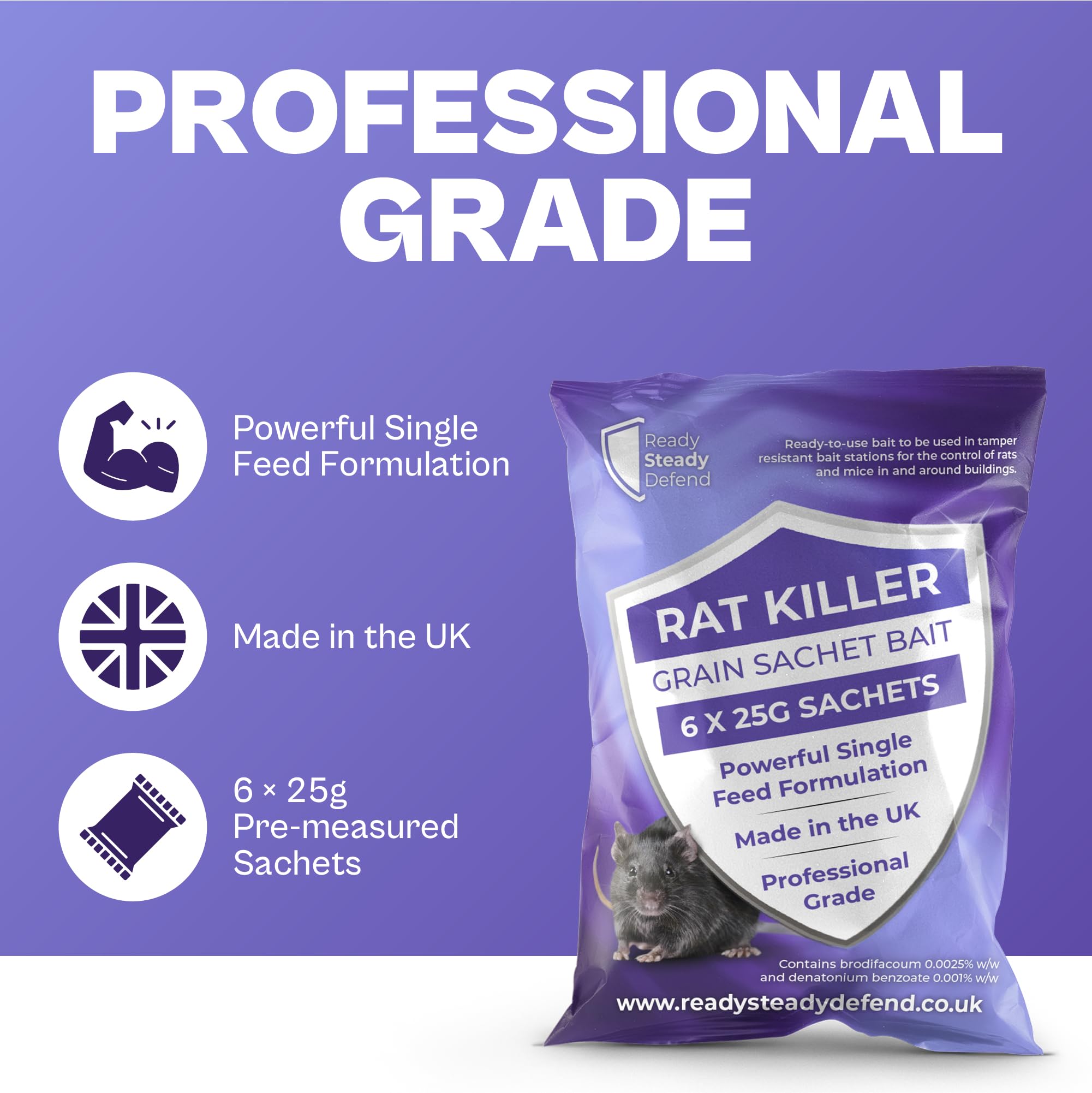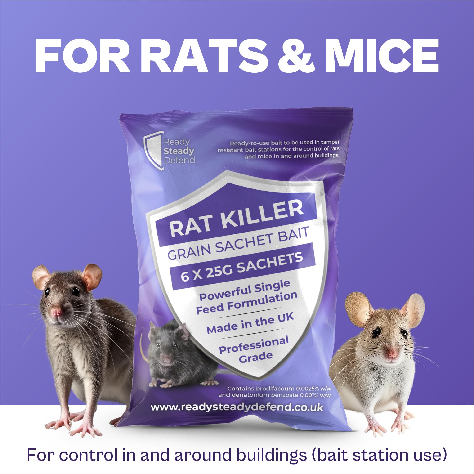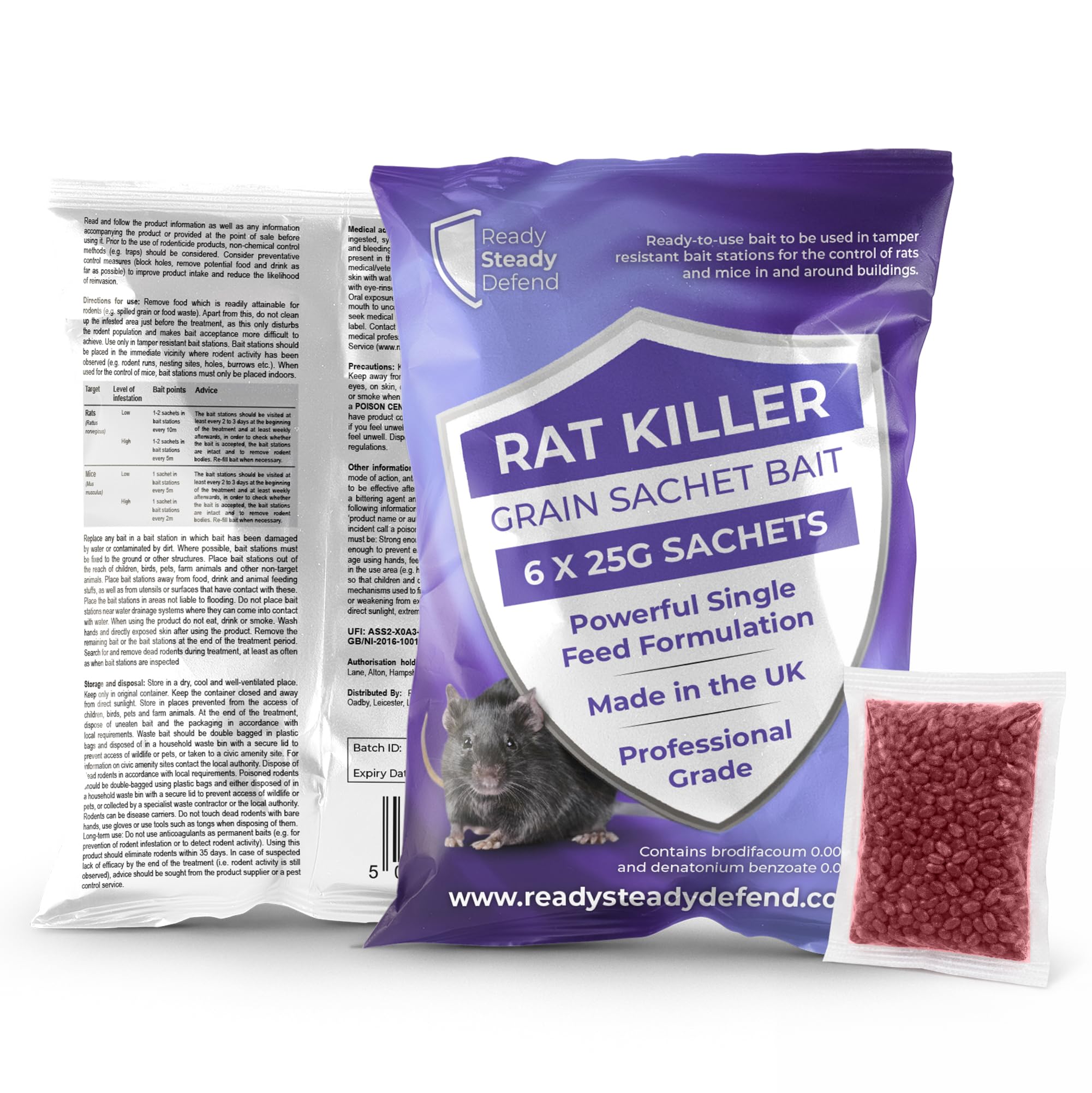 Details: Ready Steady Defend Rat Killer Grain Sachet Bait is a professional grade, ready-to-use rodenticide for controlling rats and mice in and around buildings. Pack contains 6 x 25g grain sachets with a powerful single feed formulation. Contains brodifacoum 0.0025% w/w and denatonium benzoate 0.001% w/w plus a bittering agent and dye. Before use, read all product information. Consider traps and prevention (block holes, reduce accessible food and drink). Remove readily available food, but do not disturb the infested area immediately before baiting. Use only in tamper resistant bait stations placed where activity is seen. For mice, bait stations must be placed indoors only. Fix stations where possible, keep them dry, and place out of reach of children, pets and other non-target animals. Keep stations away from food, drink and animal feed. Dose guide: Rats low 1–2 sachets every 10m, high 1–2 sachets every 5m. Mice low 1 sachet every 5m, high 1 sachet every 2m. Inspect stations every 2 to 3 days at the start and at least weekly afterwards. Refill when needed, replace bait damaged by water or dirt, and remove rodent bodies. Safety and storage: avoid contact with eyes and skin and do not breathe dust. Do not eat, drink or smoke when using, wash hands after. Store locked up in the original closed container, in a dry, cool, well-ventilated place away from direct sunlight. Medical advice: contains an anticoagulant. If swallowed, seek medical advice immediately and show the label. Symptoms may be delayed. Antidote is Vitamin K1 by medical/veterinary personnel only. In case of incident call UK 111. Disposal: remove remaining bait and stations at the end of treatment, search for dead rodents, and dispose of bait, packaging and rodents to local requirements (double-bagged, secure-lid bin or civic amenity site). Hazardous to wildlife. Do not use anticoagulants as permanent baits. UFI: ASS2-X0A3-700K-WWC8. Authorisation GB/NI-2016-1001-0005. Delayed action, can take 4–10 days max.