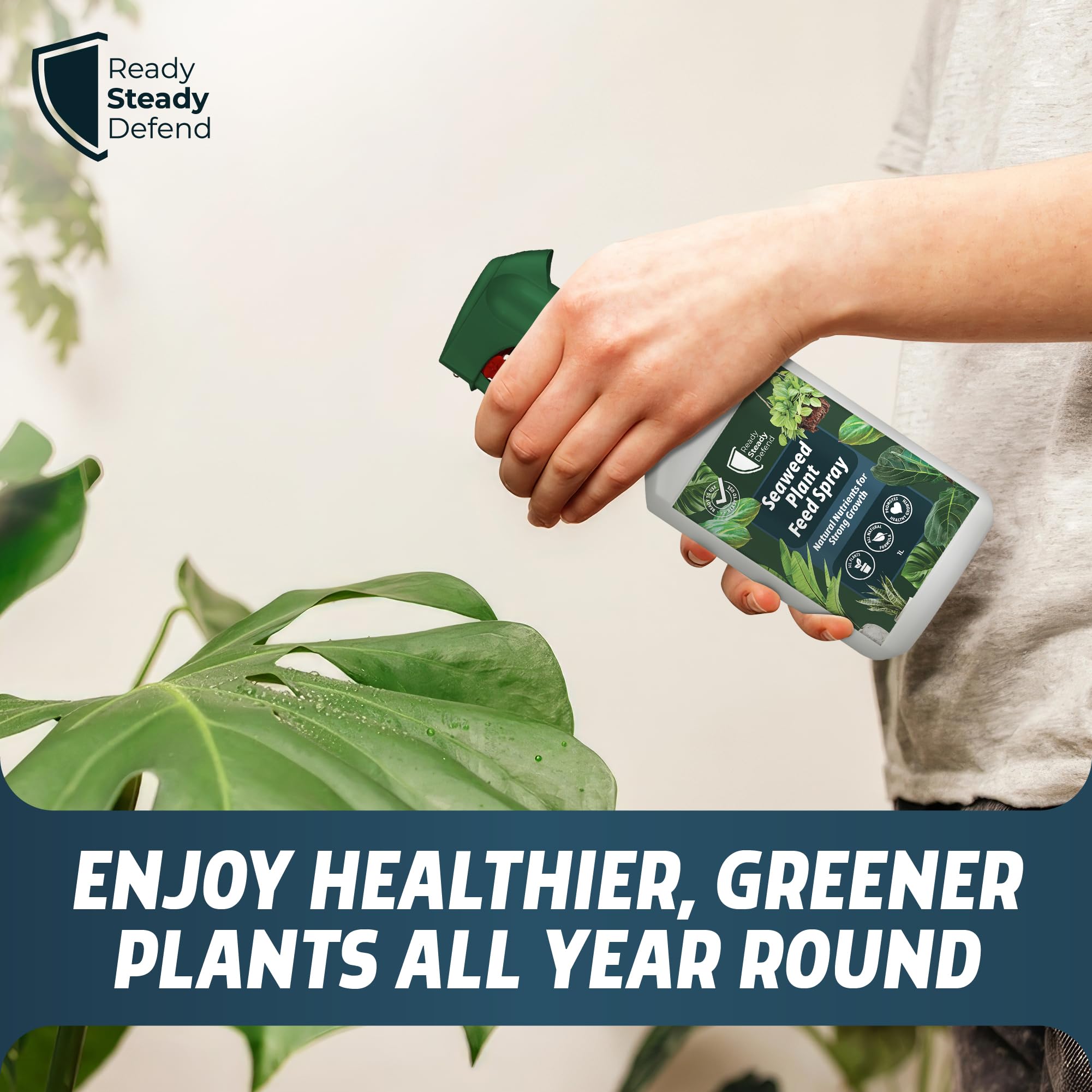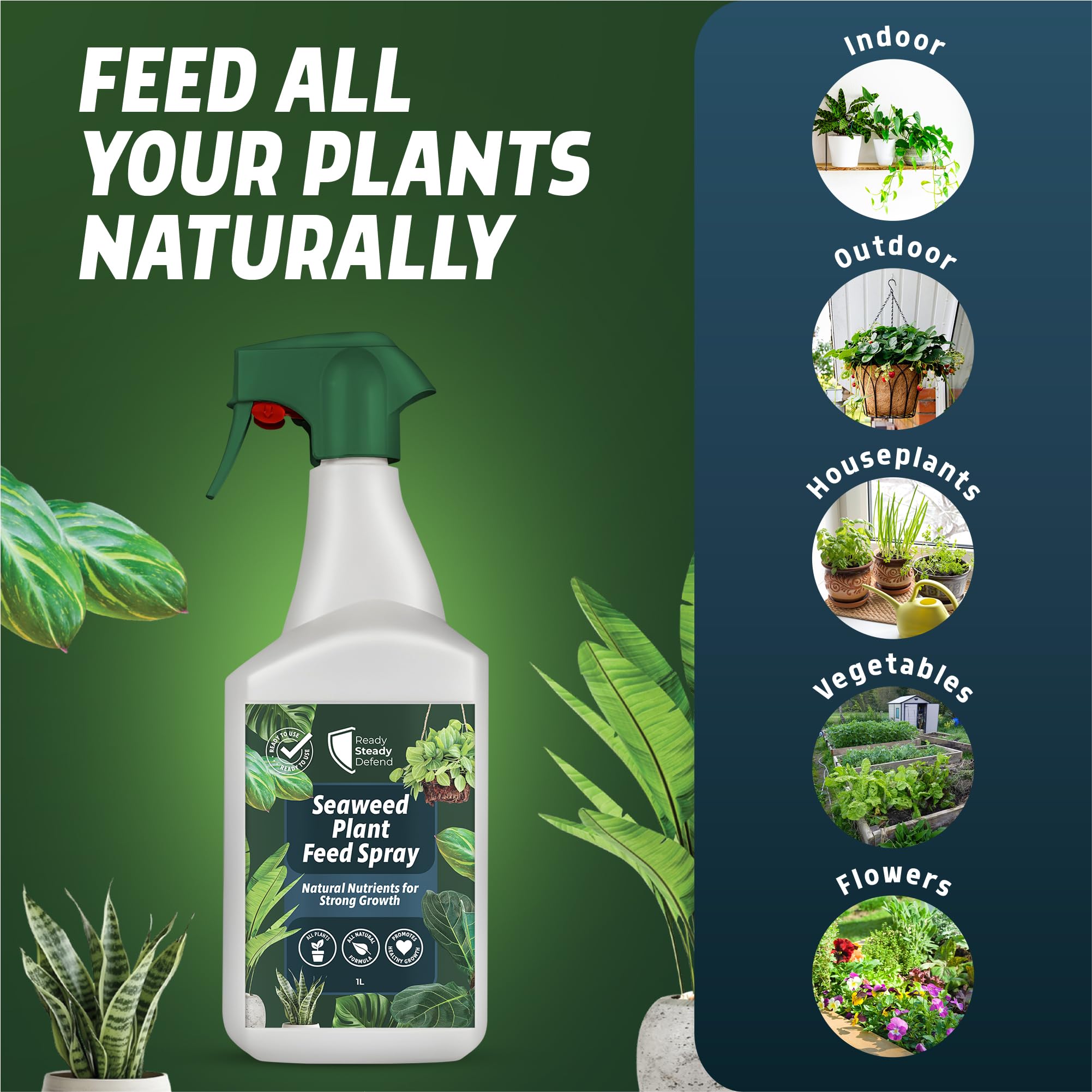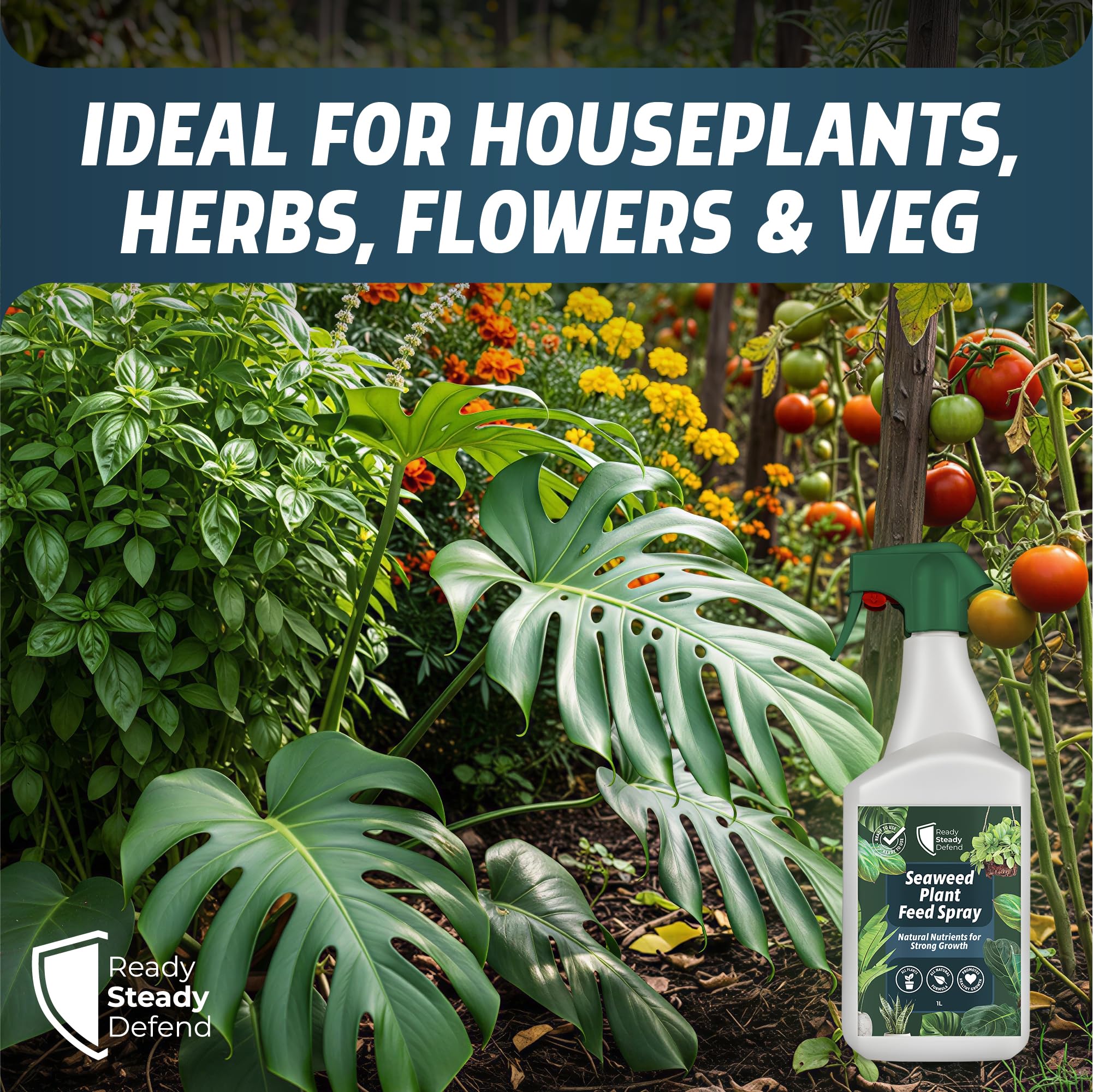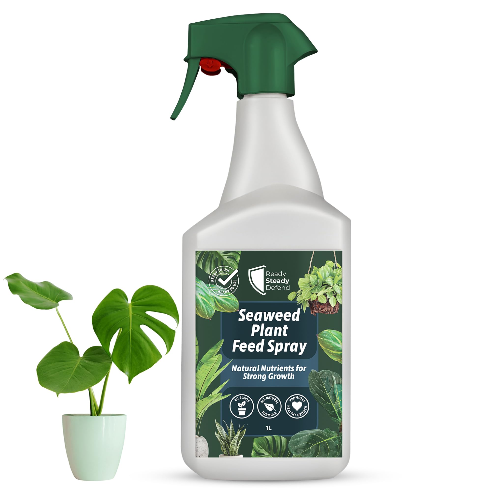 Details: Product description Give your plants a natural boost with Ready Steady Defend’s Seaweed Plant Feed Spray — an organic, nutrient-rich fertiliser designed to promote strong, healthy growth in all indoor and outdoor plants. Formulated with pure seaweed extract (Ascophyllum nodosum), this ready-to-use liquid feed provides essential trace minerals and plant growth compounds that naturally enhance plant health and resilience. Suitable for houseplants, herbs, flowers, shrubs, and vegetables, this seaweed fertiliser helps nourish foliage and strengthen roots for vibrant, long-lasting growth. It delivers key nutrients such as cytokinins, betaines, and auxins, which support photosynthesis, improve nutrient uptake, and stimulate natural plant development without relying on synthetic chemicals or additives. Perfect for use at home, in gardens, or in greenhouses, this organic seaweed plant food is simple to apply — just shake and spray evenly over leaves until lightly coated. Use every 1–2 weeks during active growing periods to keep your plants lush and thriving. For best results, spray in the early morning or evening, avoiding direct sunlight or open blooms. The eco-friendly, biodegradable formula makes this liquid plant feed a sustainable choice for all gardeners. It’s safe for pets and children when used as directed and offers a natural alternative to harsh fertilisers or chemical boosters. Ideal for popular houseplants like Monstera, Peace Lily, and Ferns, as well as outdoor flowers and vegetables, Ready Steady Defend’s Seaweed Plant Feed Spray helps every plant reach its full potential — naturally. Ingredients Aqua, Seaweed Extract Directions Shake well and spray evenly onto leaves until lightly coated. Apply every 1-2 weeks during active growing periods. Spray in the early morning or evening, avoiding direct sunlight or open blooms. Safety Warning Always follow the instructions on the label. Keep out of reach of children and pets. Do not ingest. If swallowed, seek medical advice immediately. Store in a cool, dry place away from direct sunlight. Do not use on plants intended for human consumption without proper dilution and washing.