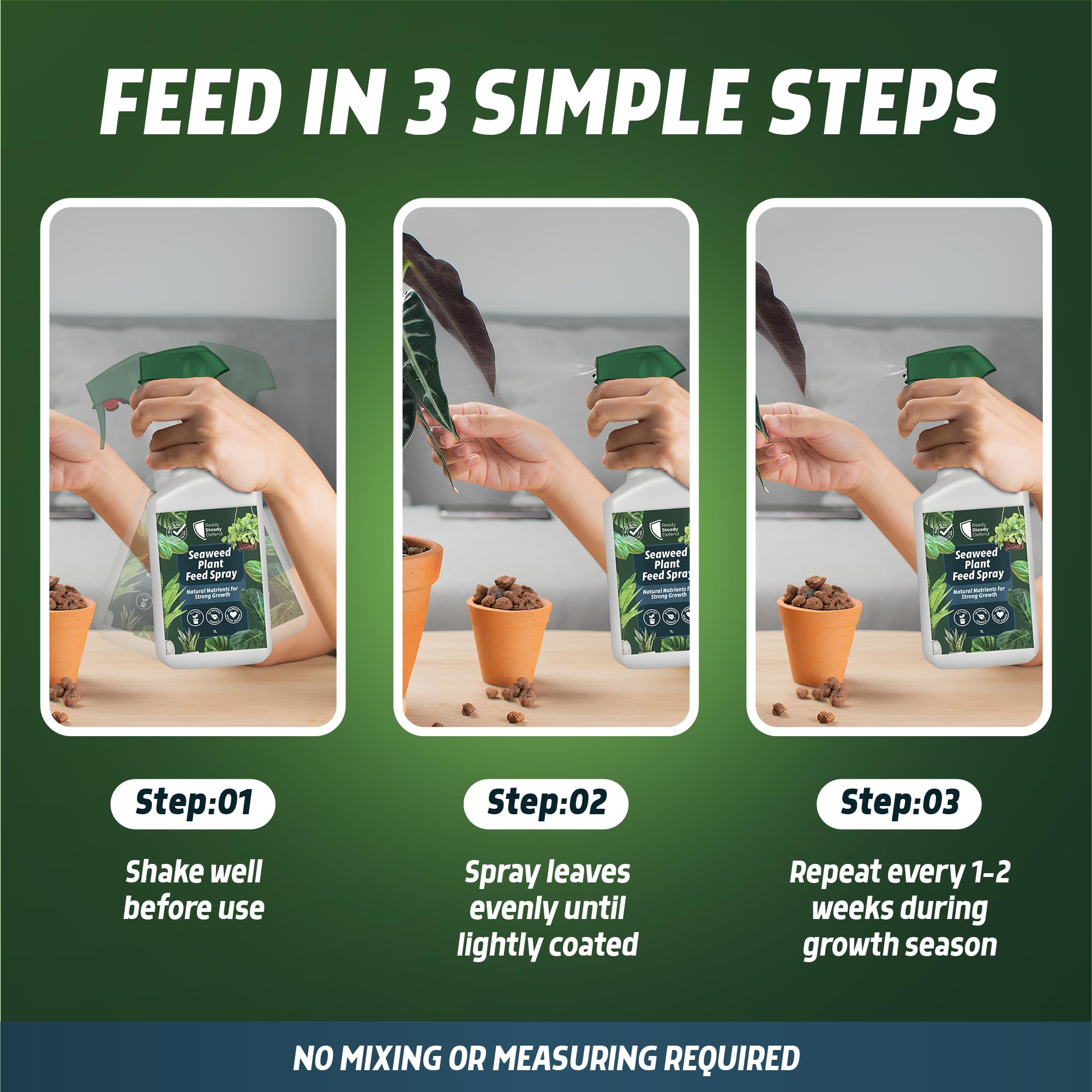 - Ready-to-use seaweed feed spray makes plant care effortless. Simply shake well and spray evenly onto leaves until lightly coated. Apply every 1–2 weeks during growing season to maintain vigorous, green, and healthy plants indoors or outdoors all year.