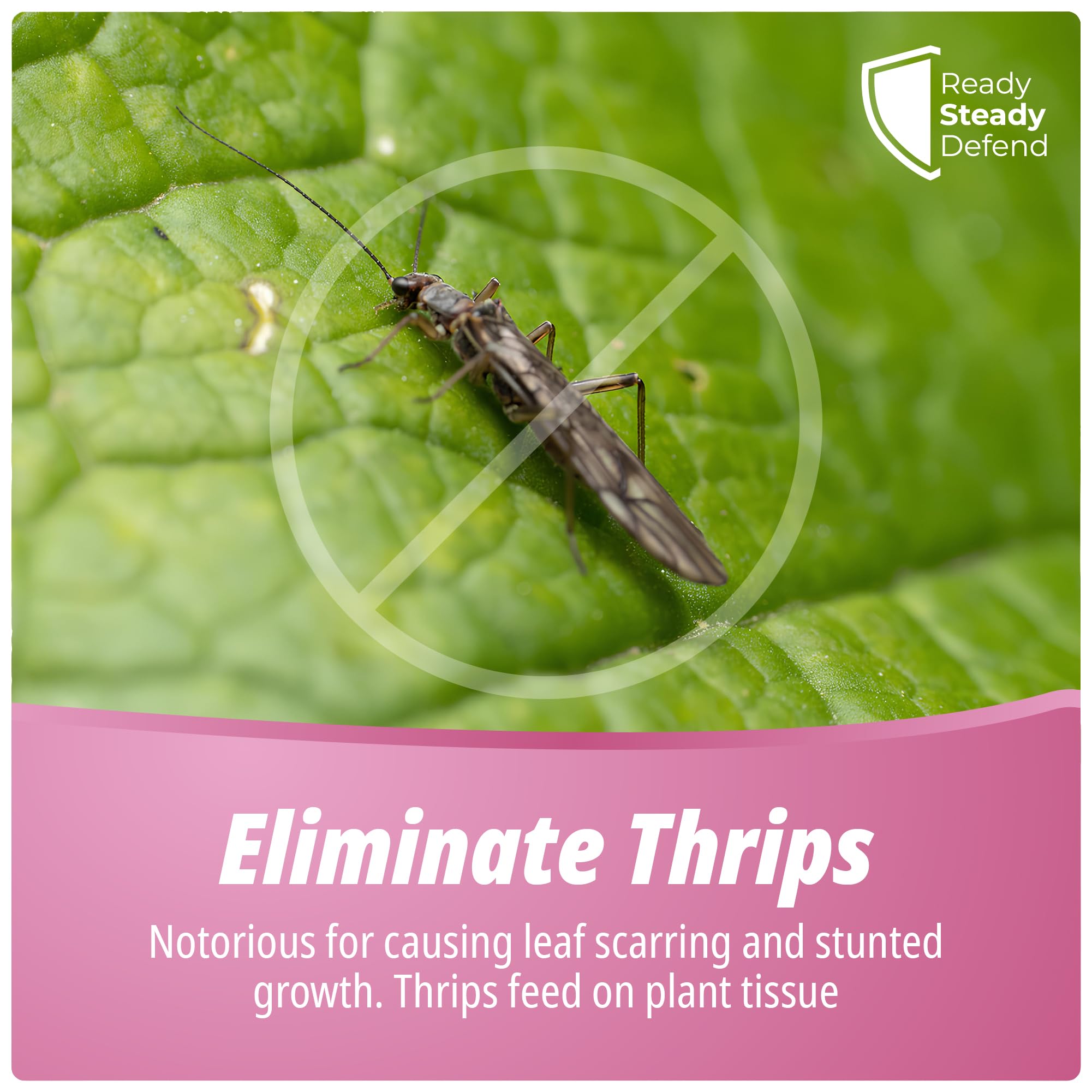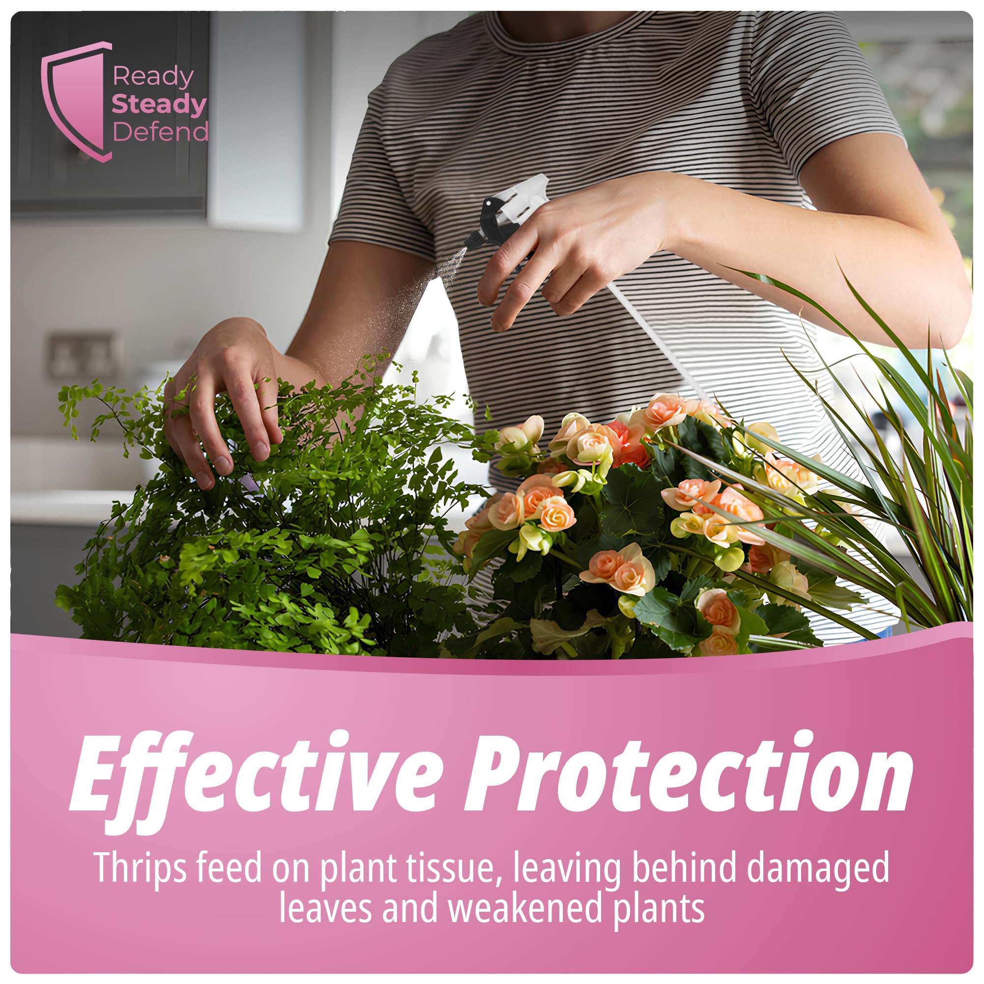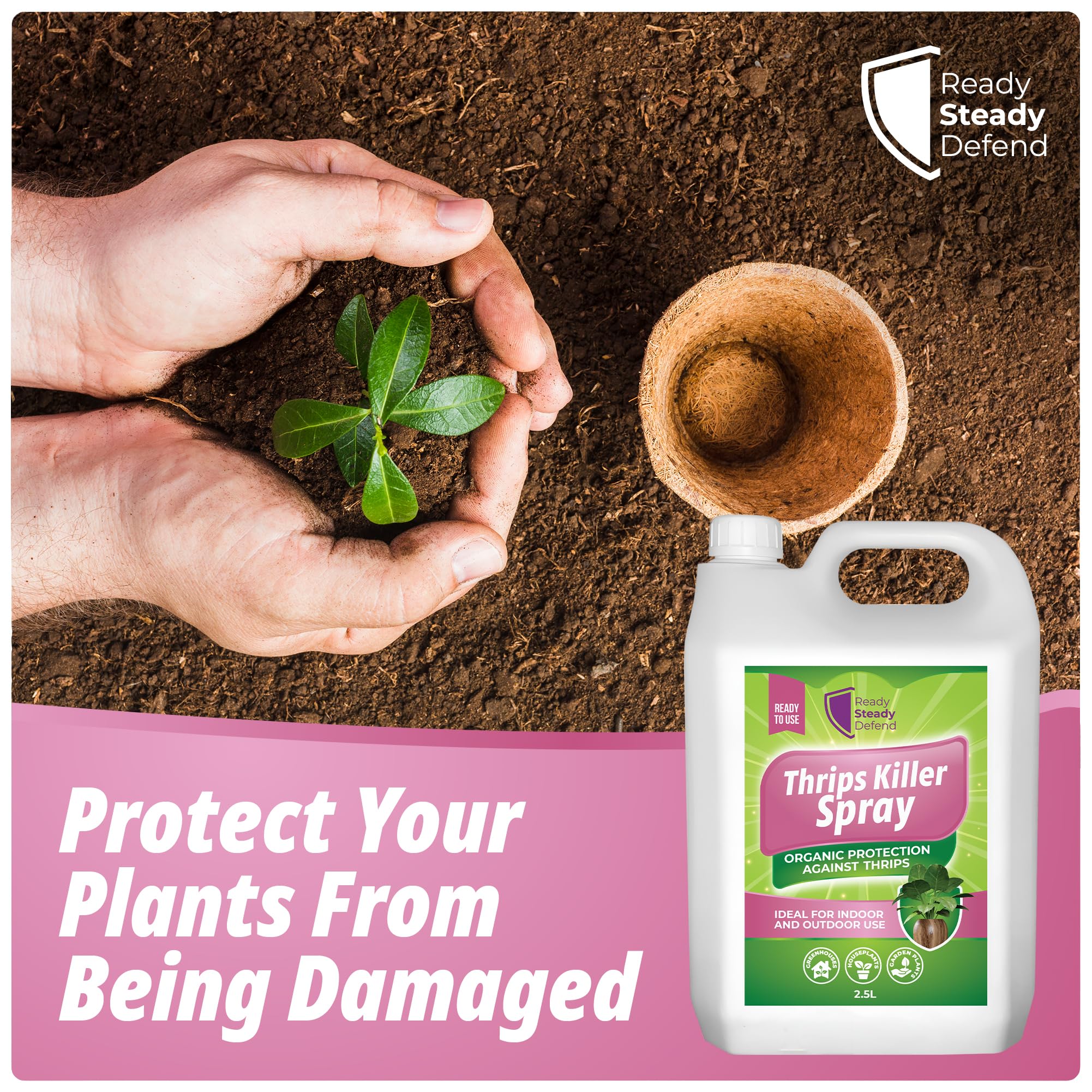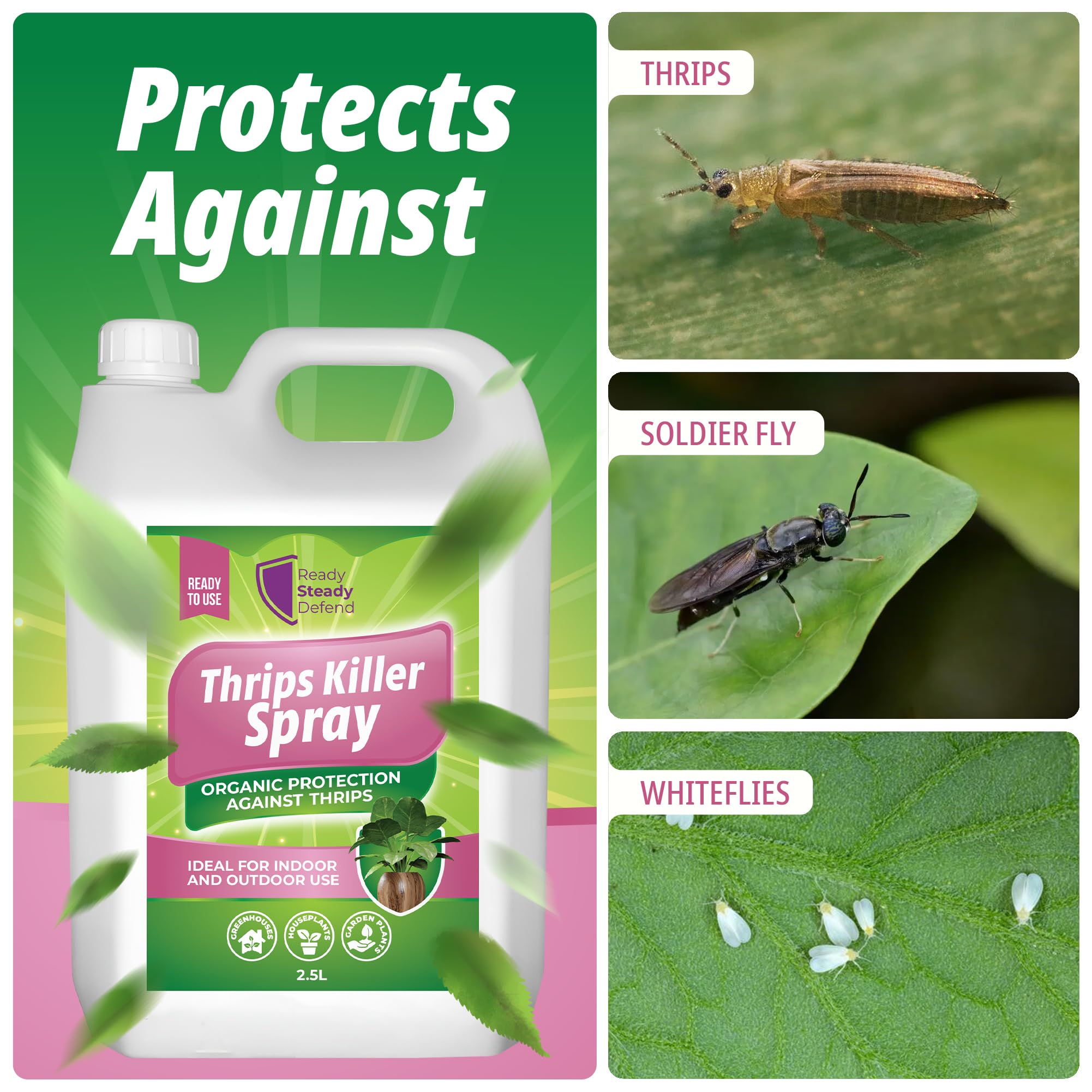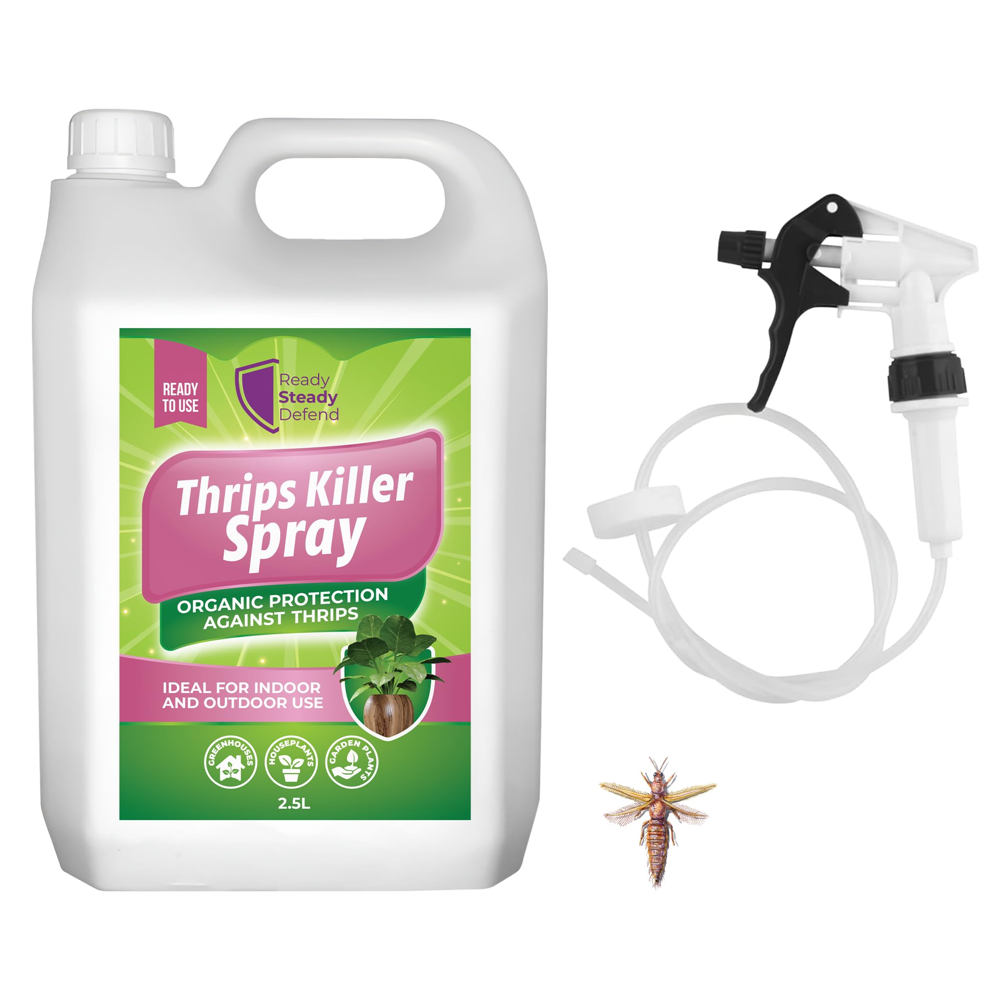 Details: Protect your plants from thrips and other soft-bodied pests with Ready Steady Defend Thrips Killer Spray 2.5L, a natural, eco-friendly insecticidal soap designed for powerful yet gentle pest control. Formulated with potassium salts and natural soya oils, this spray provides safe, biodegradable protection for large plant collections in homes, gardens, and greenhouses. Thrips are notorious for damaging leaves, causing scarring, and stunting plant growth. This fast-acting thrips killer spray targets both adults and larvae, breaking down their protective coating on contact for effective pest elimination. It helps stop infestations quickly while promoting healthier, stronger plants. The large 2.5L capacity makes it ideal for gardeners tackling heavy infestations or caring for expansive indoor and outdoor plant areas. It’s perfect for use on houseplants, ornamentals, fruit trees, vegetables, and flowering plants—providing broad-spectrum protection without harsh chemicals. Easy to use and ready straight from the bottle, simply shake well and spray evenly over affected leaves, stems, and undersides where thrips are active. For complete control, reapply every 7–10 days or after watering or rainfall. Its gentle, non-staining formula ensures clean results, leaving no sticky or oily residue behind. Unlike traditional chemical pesticides, this natural thrips spray is eco-friendly, bee-safe, and biodegradable, making it a responsible choice for sustainable gardening. Safe for people, pets, and pollinators, it protects your plants while preserving the balance of your environment. Regular use of Ready Steady Defend Thrips Killer Spray 2.5L keeps your plants vibrant, pest-free, and thriving season after season. Whether you’re maintaining a lush greenhouse or protecting a large home garden, this spray provides the strength and safety you need for reliable, natural pest defence.