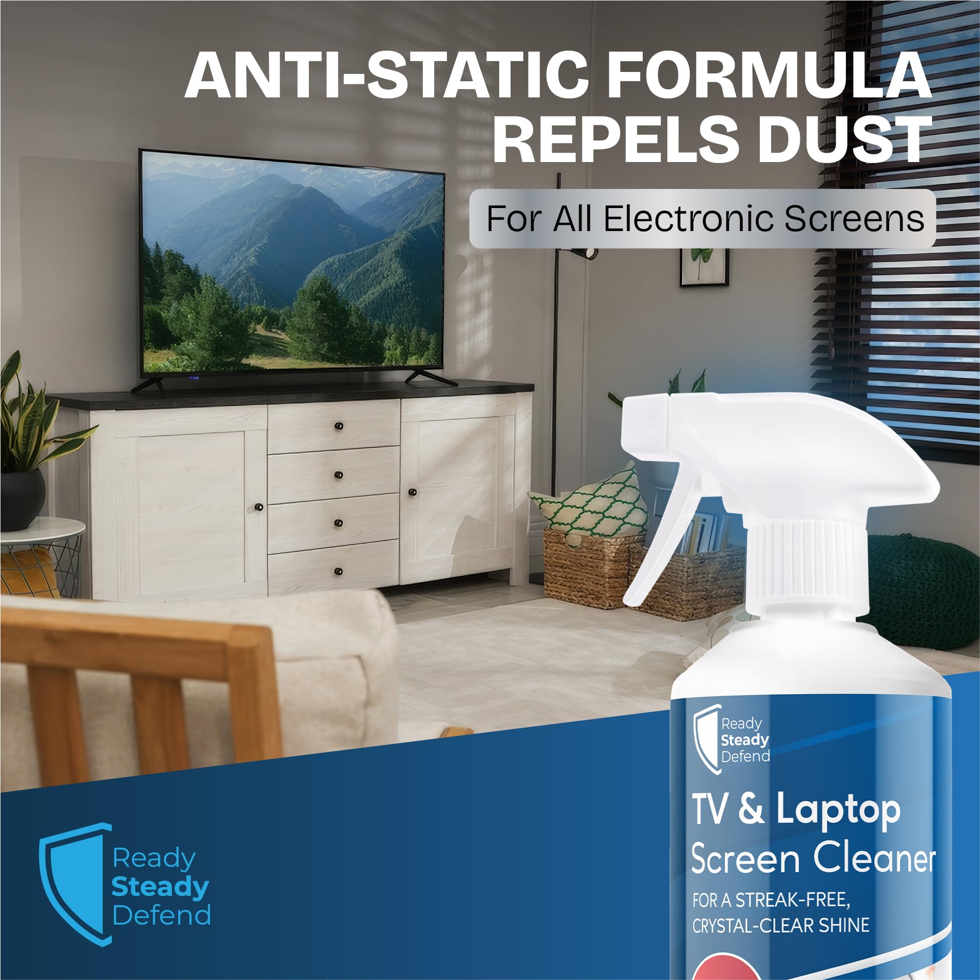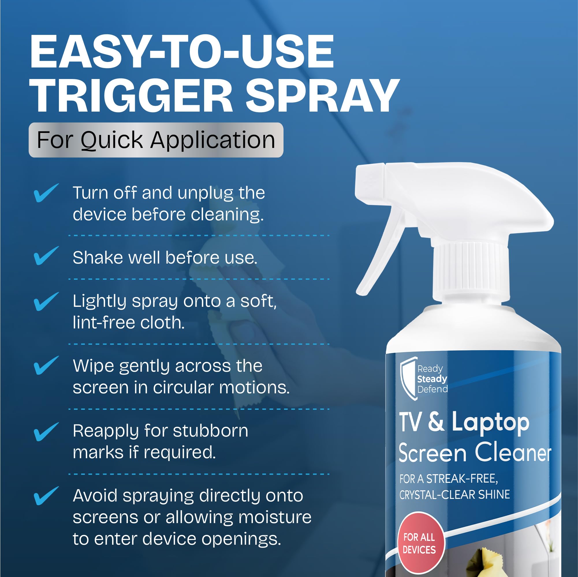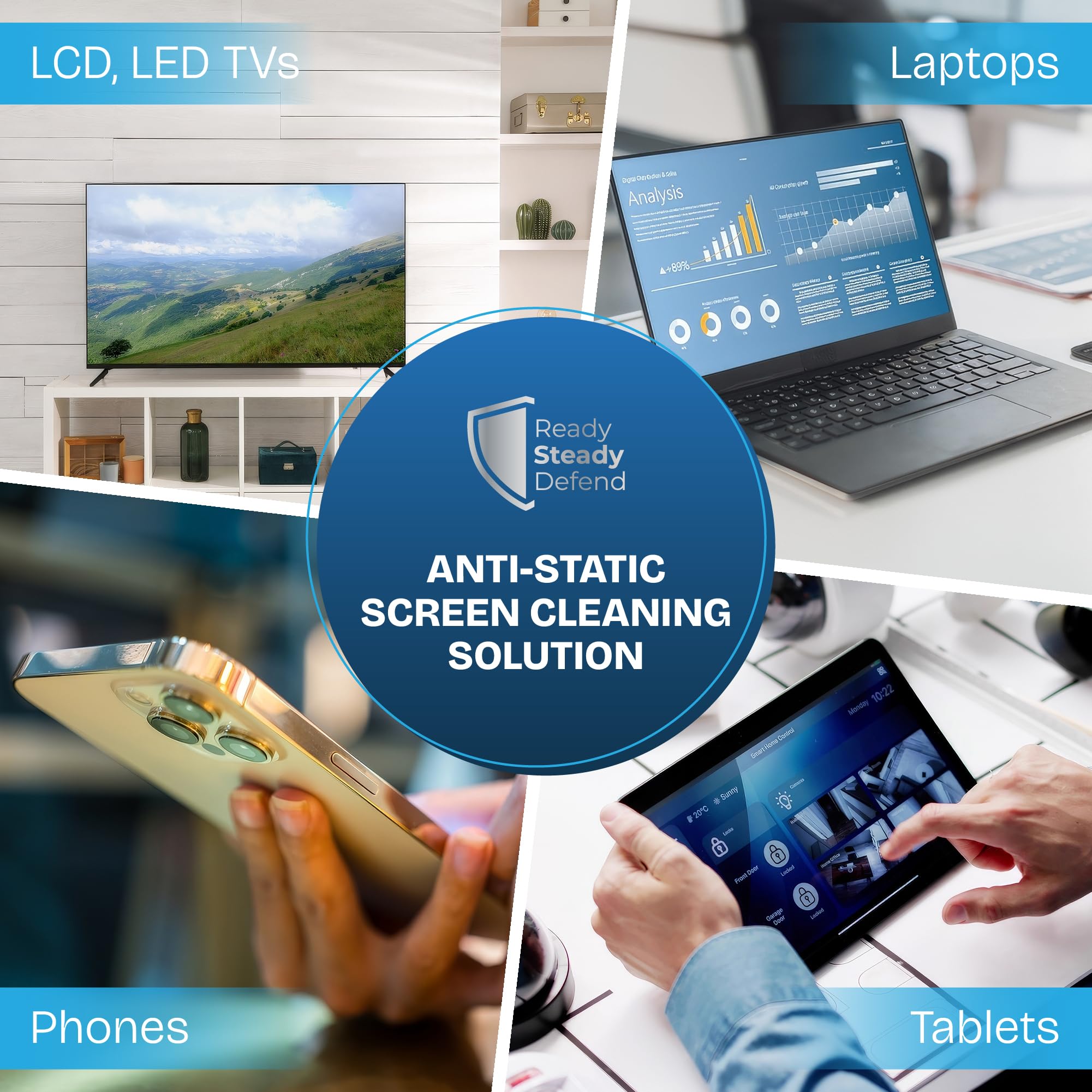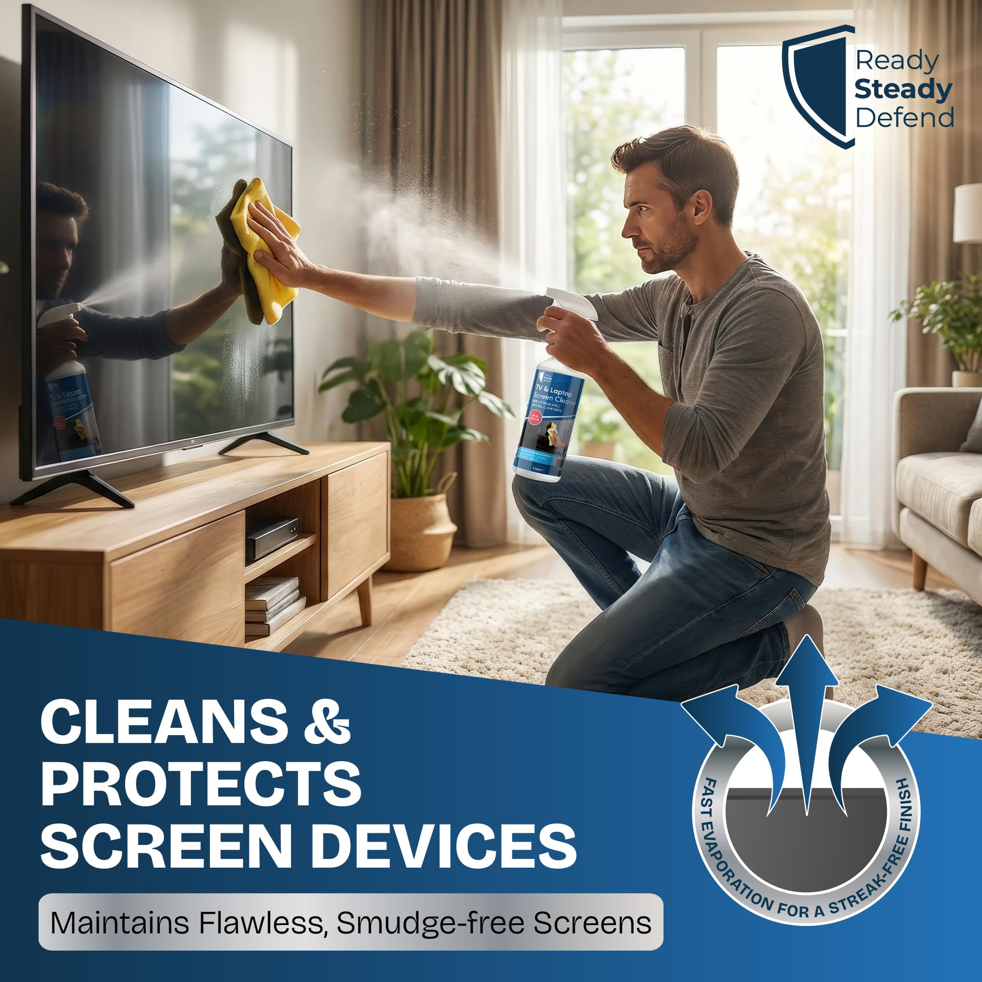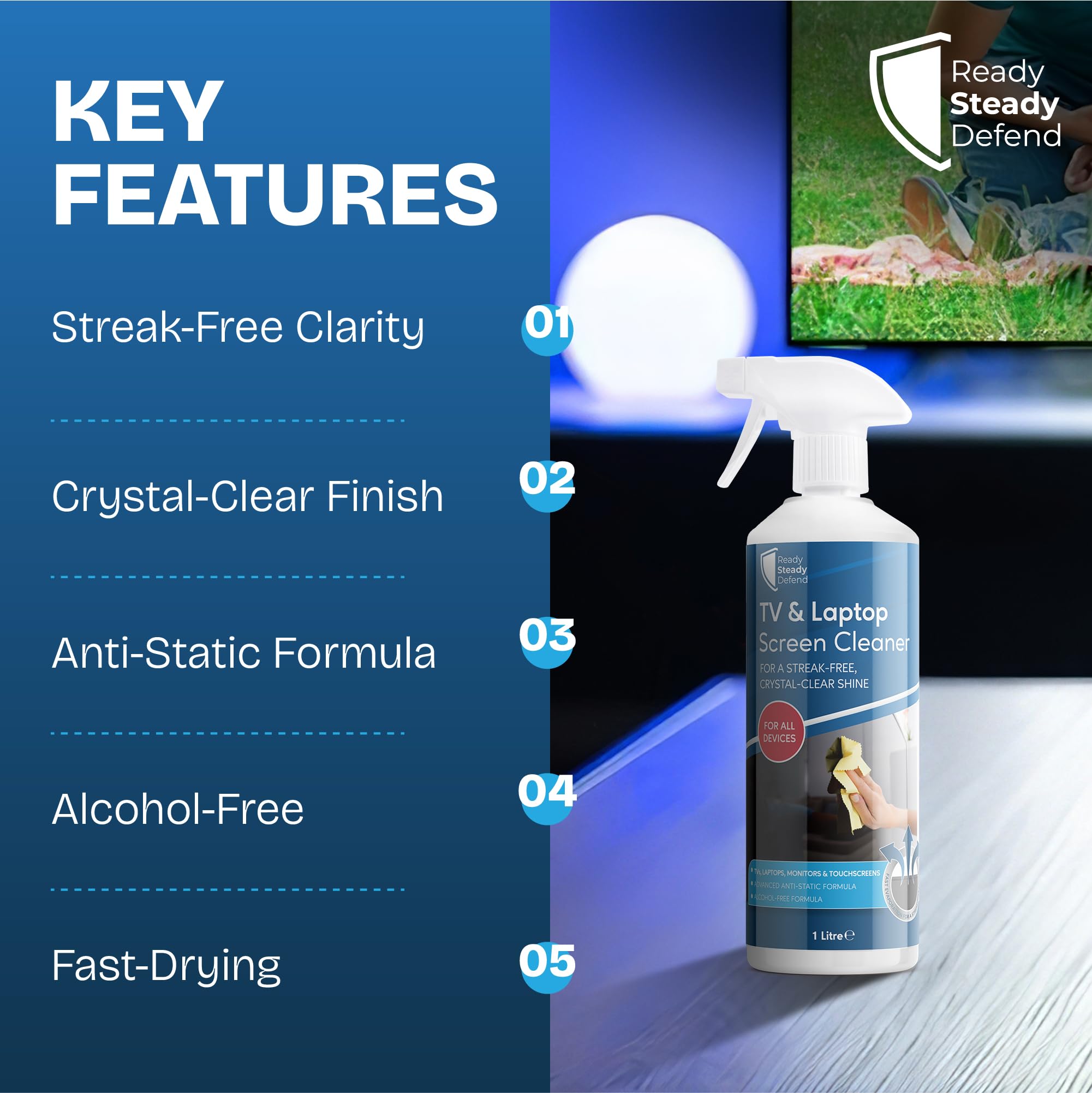 Details: Keep your screens spotless and crystal-clear with Ready Steady Defend TV & Laptop Screen Cleaner 1L, the ultimate alcohol-free screen cleaning spray for all LED, OLED, LCD, and touchscreen displays. Engineered for performance, this professional screen cleaner removes fingerprints, dust, dirt, and greasy smudges effortlessly, leaving behind a streak-free, anti-static shine. Formulated without alcohol, ammonia, or toxic chemicals, it’s completely safe for sensitive coatings and surfaces. Whether you’re cleaning your smart TV, gaming monitor, office computer, laptop, tablet, or smartphone, this non-toxic, streak-free screen cleaner restores vivid clarity and enhances every viewing experience. Unlike harsh cleaners that can damage displays, Ready Steady Defend’s gentle yet effective solution preserves screen integrity and delivers a professional-grade finish. Its anti-static technology actively repels dust and prevents future build-up, helping your devices stay cleaner longer — ideal for homes, offices, schools, and professional environments. Simply spray onto a microfiber or lint-free cloth and wipe gently in circular motions. No streaks, no residue, no hassle — just brilliant, polished screens that look brand new. Perfect for daily maintenance and deep cleaning, this screen cleaning solution combines performance, safety, and eco-conscious design in one large 1L value bottle. Proudly developed in the UK, Ready Steady Defend Screen Cleaner is your go-to for total screen protection and lasting clarity. Trusted by professionals and tech lovers nationwide, it’s the smart way to keep your devices looking flawless.